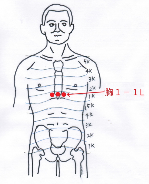 背3-1Kは心臓と関係が深く、胸のドキドキする症状などに特別な効果があります。次に脾経の親は心経ですから手の心経を診ると、手掌1-1Lに虚の反応がありました。そこからウエーブで胸に飛び胸の1-1Lを治療点とした。