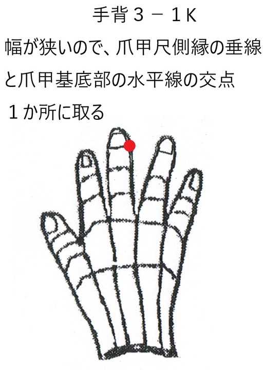 手背3-1Kは頭の3-1Kと密接な関係にあります。うつ病、頭の回転が悪い、頭がボーっとする、考えが纏まらない、などの時に有効なツボです。頭の3-1Kを直接取穴するときと、手背から頭を狙う時と2通りあります。
