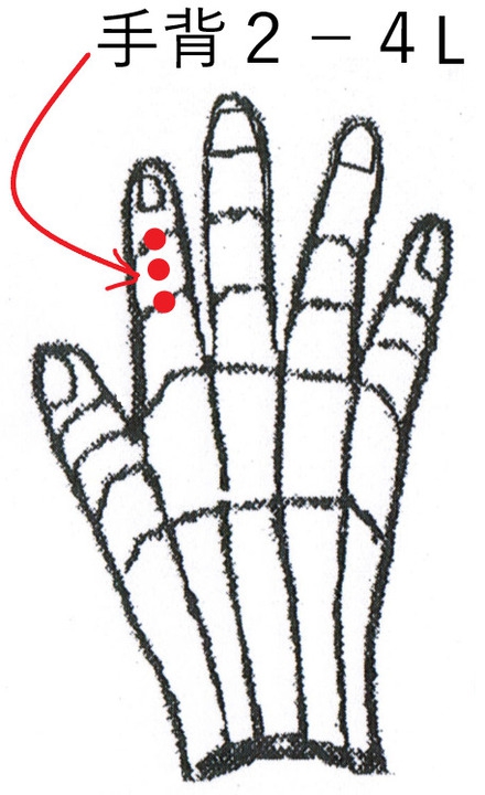 頭と手背、足背は密接な関係にありますので、治療点は頭に取るか、手足に取るかを比較検討した。最も虚の反応が強く表れている所が、手背2-4Lであった。そこで治療点は手背2-4Lとした。