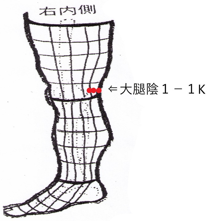 左腎経1-1Kと右腎経1-1Kのどちらに実反応が強いか検査してみると右腎経1-1Kの方が強い反応を示す。そこから右大腿陰1-1Kに飛び治療点は右大腿陰1-1Kとなった。