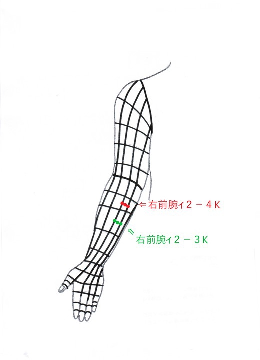 右前腕陰2-4Kと右前腕陰2-3Kに印を付け、実と虚の反応であるから、まず接触鍼で45回擦り、実の反応を取り除いた。次に残っている虚の反応に対して知熱灸をして虚の反応を取り除いた。