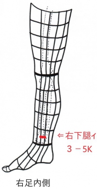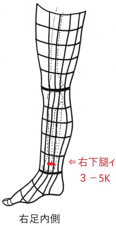 左足底の3-5Kに実と虚の反応が出ていた。左足底と右足底を比較すると、左足底の方に実が強い。そこから右下腿ィ3-5Kに飛び、右下腿ィ3-5Kが治療点となった。