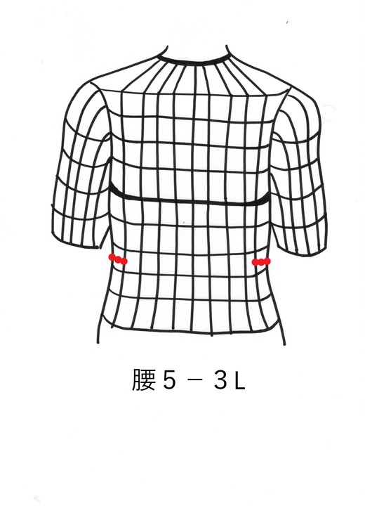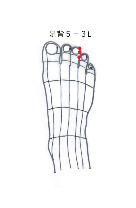 腰の両脇となると5Lのラインである。手背、足背、の5Lラインを提鍼で検査すると足背の5Lラインに虚の反応が出ていた。5Lラインのどこが虚になっているか番地を探すと、足背5-3Lに虚の反応が出ていた。そこからウエーブで腰に飛び治療点は腰の5―3Lとなった。