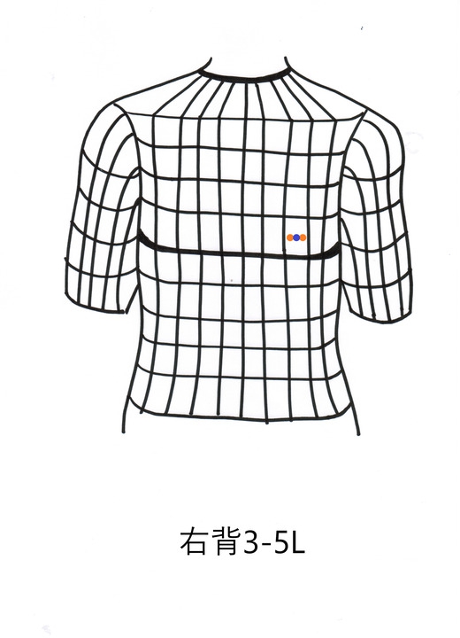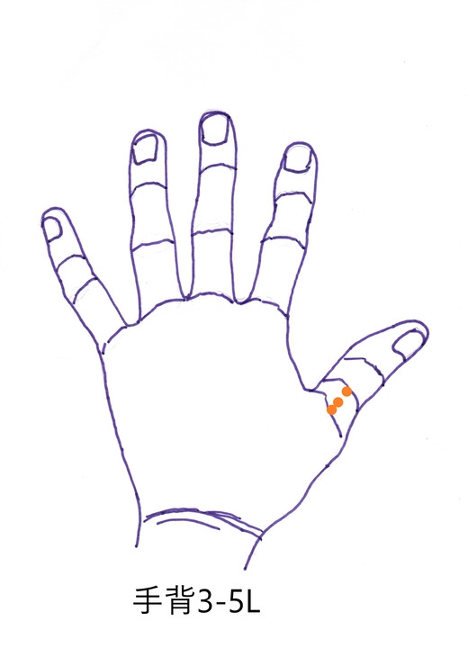 右背中の3-5Lに印を付け、実と虚の反応であるから、最初に接触鍼で35回ほど擦り実の反応を取り除いた。その後、残っていた虚の反応に対して知熱灸を5壮ずつ据えた。