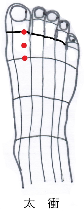 次に、太衝穴の実反応に対して、印を付けてから接触鍼で35回ほど擦り瀉法を行なった。