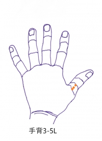 そこで左拇指陽の大腸経1に提鍼を当て実の反応を探した。大腸経の3-5Lに実の反応が出ていた。そこからウエーブで左上腕に飛び、さらに右背に飛んで、治療点は右背3-5Lとなった。実と虚の反応があった。