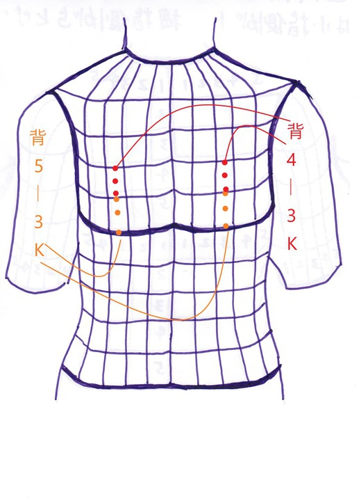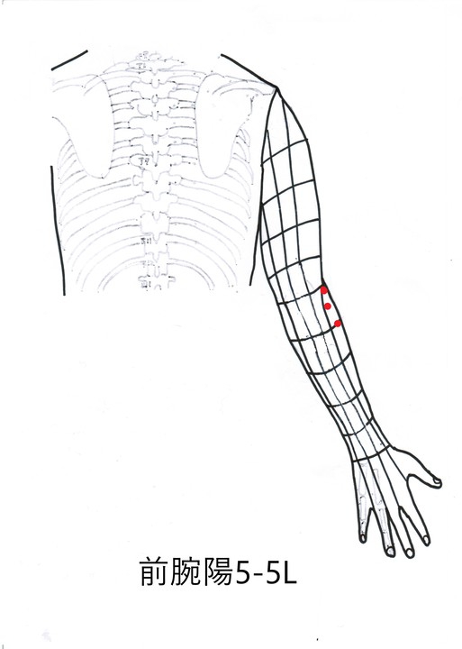 治療点は、前腕陽5-5L、背5-3K、背4-3Kの3カ所である。印を付けてから、接触鍼を35回ずつ行った。実の反応が取れたのを確認して、鍼治療は終わった。