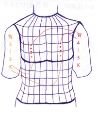肝経陽(足背拇指)では5-3Kが実と虚の反応を示していた。 胃経(足背示指)では4-3Kが実の反応を示していた。そこからウエーブで背中に飛び、肩凝りの治療点は背5-3K、背4-3Kとなった。
