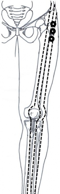 足背示指は胃経であるから、そのどこに実があるか調べてみると右足背1-4Lに実の反応があった。患部は右であるから、左足背1-4Lと比較すると左の方に実の反応が強いので、そこから左の大腿に飛び、治療点は左大腿1-4Lとなった。この治療点は右太もも外側の痛みを取り除く。
