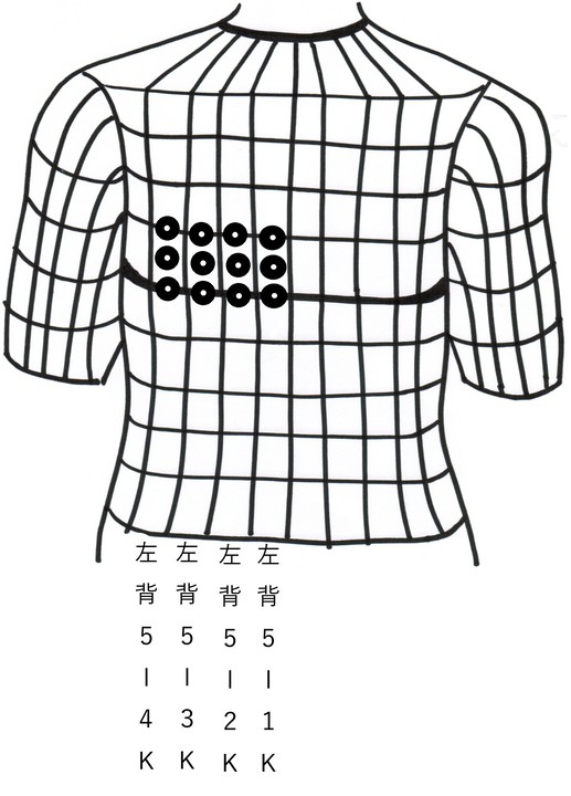 この治療で身体を動かしてみると少し楽になったが、まだまだ痛いと言うので、左背5-3K、左背5-2K、左背5-1Kと順次接触鍼と知熱灸を追加した。