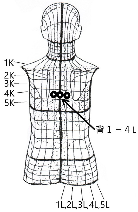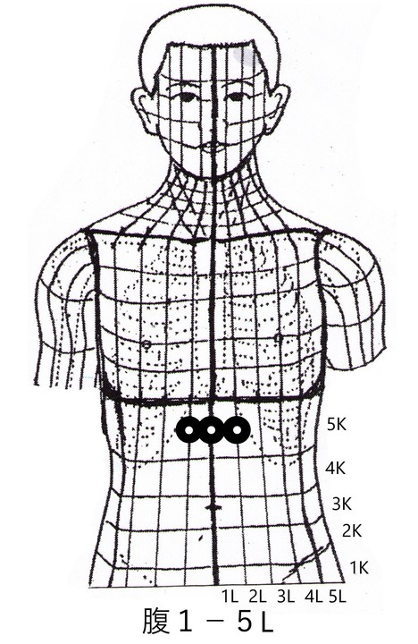 胃の疾患には表裏の観点から背中の治療穴をよく使うので、背中に提鍼を当て、虚の反応を探すと背1-4Lに虚の反応があった。そこで腹1-5Lと背中1-4Lで背中と腹で胃腸を挟むようにして補う事にした。