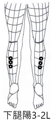 両方のふくらはぎがつると言うので、足背から、下腿陽に飛び、両側の治療点下腿陽3-2Lを治療点とした。これは患部の直接治療のように思われるが、両側であるから、右の治療で左患側を狙い、左の治療で右患側を狙い治療している。