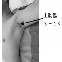 左肩の上腕陰3-1Kに印を付け、虚の反応であるから知熱灸で虚の反応が無くなるまで施灸をした。虚の反応が無くなったので、腕の曲げ伸ばしや、肩の回転をして右肩のダルサを確認して貰った。