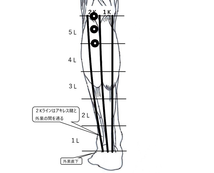 左下腿陽5-2Lに印を付けた。ここは実と虚の反応であるから、接触鍼をして実の反応を取り除いた後、残っている虚の反応に対して知熱灸をした。治療後キックの動作をしてもらったところ、全く痛みが無くなったと言う。1回目の治療を終了する。