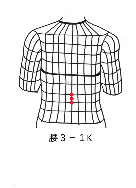 そんな時、鍼灸治療の特効穴として腰陽関の上の棘突起を中心にその上下3センチの点を治療点として使います。普門堂ではその治療点を腰3-1Kという定番穴として常用しています。