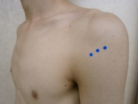 腕を斜め後方に上げると痛むのは、手背の薬指、または足背の薬指が関係する。そこで手背薬指と、足背薬指を比較脈診すると足背薬指の方に実と虚の反応が強く出ていた。足に反応がある時には反対側の大腿陽に治療点が来る。
