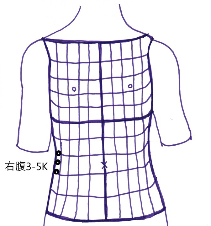 そこからウエーブで上腕陰に飛び、上腕陰から右腹に飛んで治療点は、右腹3-5Kとなった。左腹の臍から脇腹にかけて虚の反応があり、その中でも脇腹が特に虚となっていた。それで治療点が右腹3-5Kとなったのです。