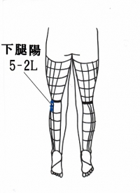 右下腿陽の痛みに対して、左下腿陽5-2Lが治療点となる。すべて痛む側の反対側に治療点を取っていることに注目してください。この治療にて、下腿の痛みも解消した。治療後、外で300メートル歩いてもらい、痛みがないことを確認して治療を終わる。