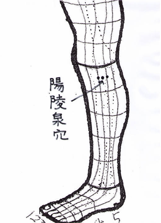 立ち座りも痛いということは、力が入らない虚とみて、足背の胆経5-3Lから下腿陽に飛び、下腿陽の5-3L(陽陵泉L)を治療点として知熱灸をすえる。