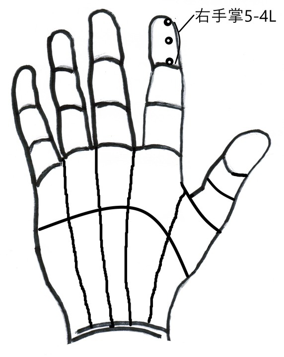 右胸のシクシクする患部が中府穴辺りであった。鍉鍼で虚実の検査をしてみると虚の反応が出ていた。右手掌で虚の反応がある所を探すと、右手掌5-4Lであった。