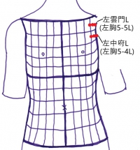 右手掌5-4Lからウエーブで右上腕陰を経て、左胸の5-4L(左中府穴)に飛んでそこが治療点となった。ちょうどシクシク痛む右中府穴の反対側となる。このように患部の反対側が治療点となる事が当院のやり方ではよくある。