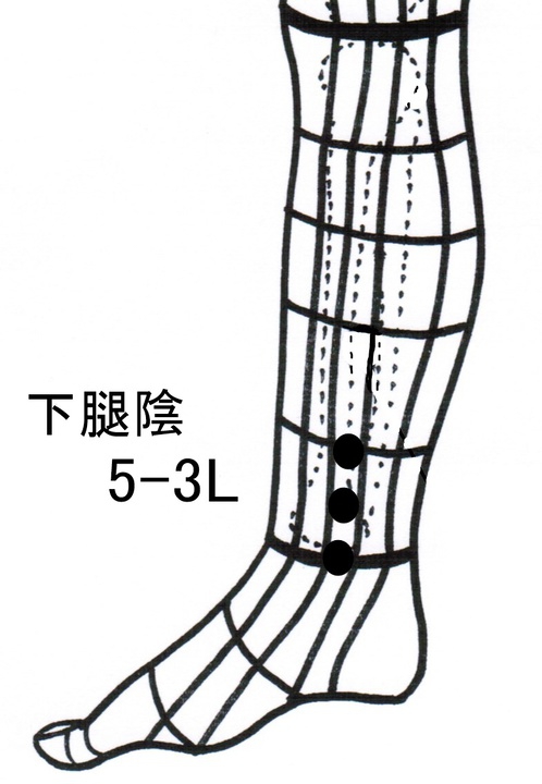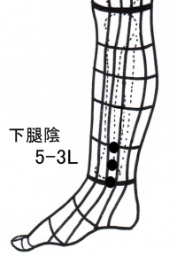 下腿内側5₋3Lと前腕陽5₋2Lが治療点となります。左右どちらの治療点を使うかは提鍼で検査して実反応のある所を探し、左右交差して使います。チョイ漏れにはこの実反応を取り除く事が効果を上げます。