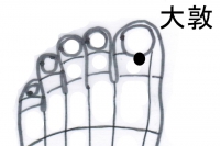 次に尿漏れの特効穴としては、太敦穴が有ります。普門堂では足の親指の爪の付け根中央に取穴します。ここを提鍼で検査すると虚の反応が出ていますから、此処を治療点として取穴します。