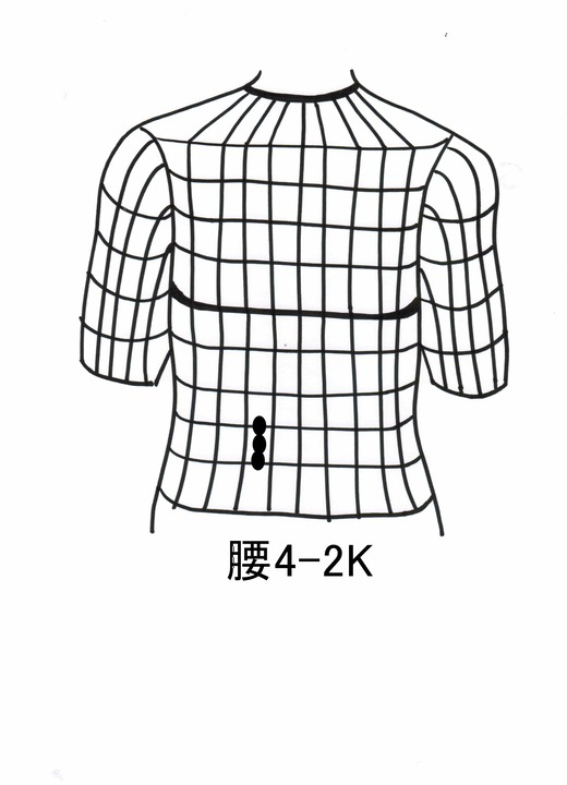 普通の腰痛であれば上記の取穴で改善されるはずであるが、今回は右側弯症がある。この右側弯症を改善させるためには、左腰の4-2Kが必要となる。考え方としては左背4-2Kで上半身を右に引き寄せ、左腰4-2Kで下半身を右に引き寄せる。