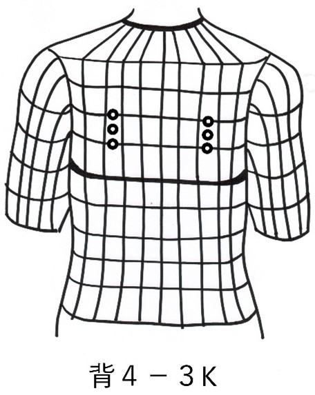 まず、①背4-3Kですが、肩の中央部(肩井穴近辺)がひどく凝るという症状の治療点です。霊台穴から左右に7cmぐらい離れた所に点を付け、その上下2cm位の点を加えた縦3点が背4-3Kの治療点です。