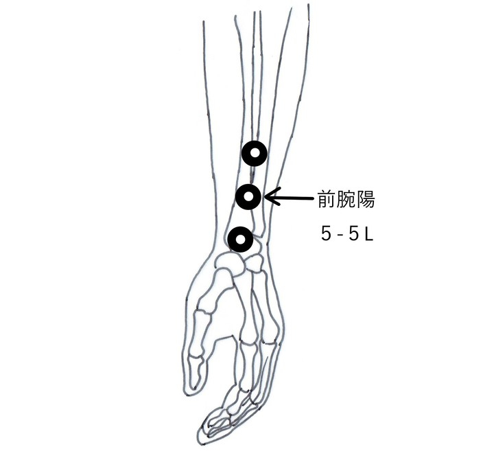 次に、②前腕陽5-5Lを治療します。ここは後頸部で耳の後ろのひどい凝りを取る効果があります。前腕の陽谿穴に印をつけ、そこから肘に向かって3~4cm位の所が前腕陽5-5Lの治療する場所です。