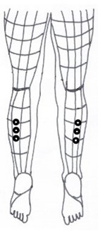ここは取穴が難しいのですが、ふくらはぎの中心部(承山点辺り)に点を付け、内側が膀胱経1行線で外側が膀胱経2行線です。その膀胱経2行線の中心部に点を付け、その上下2~3cm 位の所に点を付け、その3点が治療点となります。