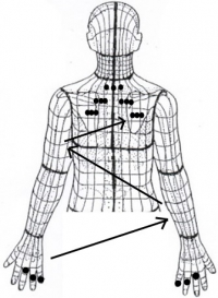 普門堂鍼灸院では、手背の第1関節、第2関節、第3関節の横のライン(親指から小指に掛けて)虚の反応が出ているのを、鍉鍼の4粒側で確認する事によって、背中にコリがあることを確認している。この反応が出ていると背中に取穴している。