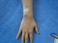 取り方 陽谿穴と曲池穴を結ぶ線上で、陽谿から4分の1に取る。