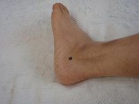 取り方 外果の直下5分くらいの所で、やや後方を押すと痛みのある部位がある、ここに取る。